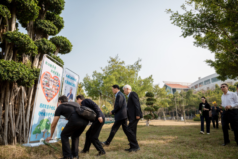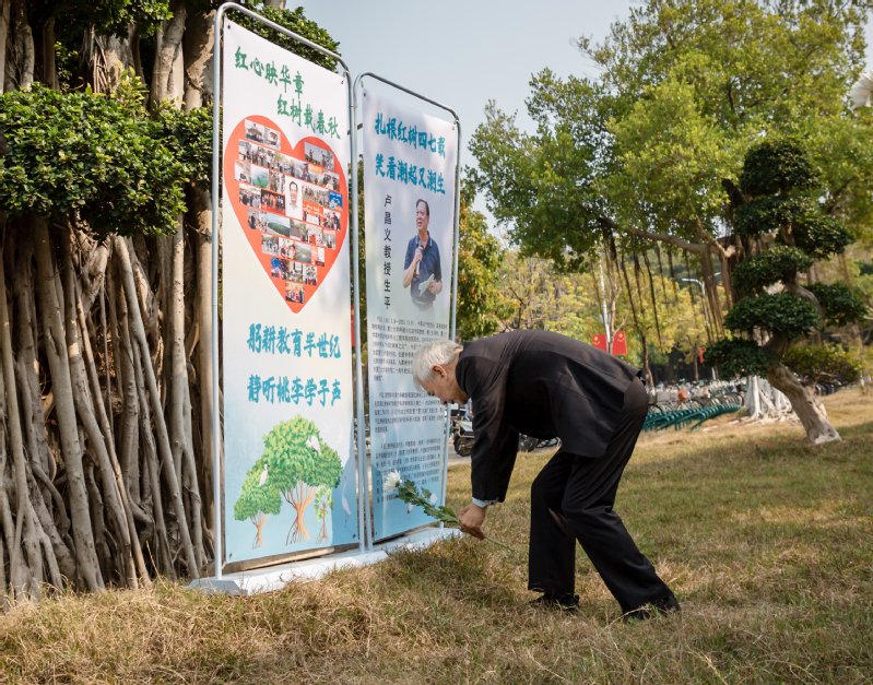 追思会的尾声,一场温馨而庄重的“重走卢昌义教授校园足迹”徒步活动及献花仪式缓缓展开。在周亮老师深情而细致的引导下,全体与会人员手执白菊花、黄菊花,步伐沉重却满怀敬意,沿着卢教授生前在校园里留下的温暖足迹,缓缓前行。每一步都仿佛在与卢教授进行跨越时空的对话,每一处都承载着对卢教授无尽的思念与缅怀。在“欣欣向荣”榕树林等缅怀地点,大家纷纷停下脚步,静静地献上手中的鲜花,让花香与哀思交织,共同寄托对卢教授的深切怀念与崇高敬意。