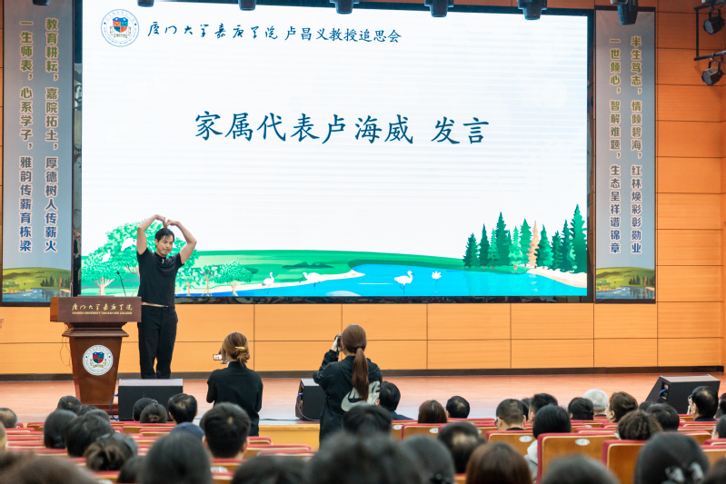 在亲属与师生代表发言环节,卢昌义教授的儿子卢海威先生首先上台,他深情地回忆了父亲对红树林的深情守望、对学子们的殷切期盼,以及那份刻在嘉庚人骨子里的对自然的敬畏、对治学的严谨、对教育的赤诚。