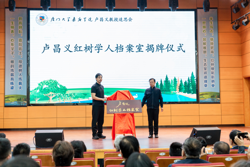 值得一提的是,追思会上举行了“卢昌义红树学人档案室”的揭牌仪式。该档案室将永久保存卢昌义教授生前关于红树林及环境生态领域的研究书稿、著作、研究成果等资料累计千余册,这些资料极具珍藏和研究价值,不仅是对卢教授学术遗产的铭记,更是对其在红树林生态研究领域卓越贡献的弘扬。揭牌仪式由卢教授家属代表卢海威先生与校领导李军常务副书记共同完成,标志着档案室的正式成立。